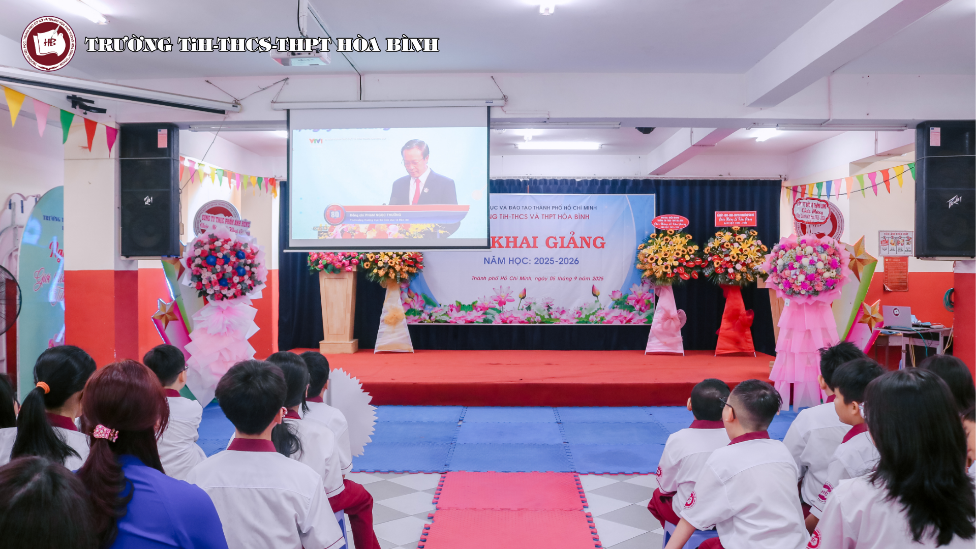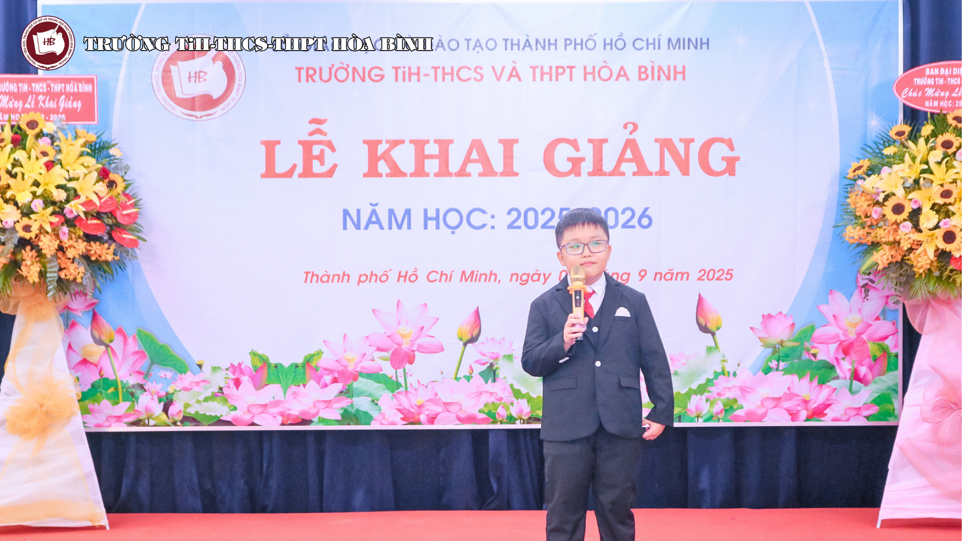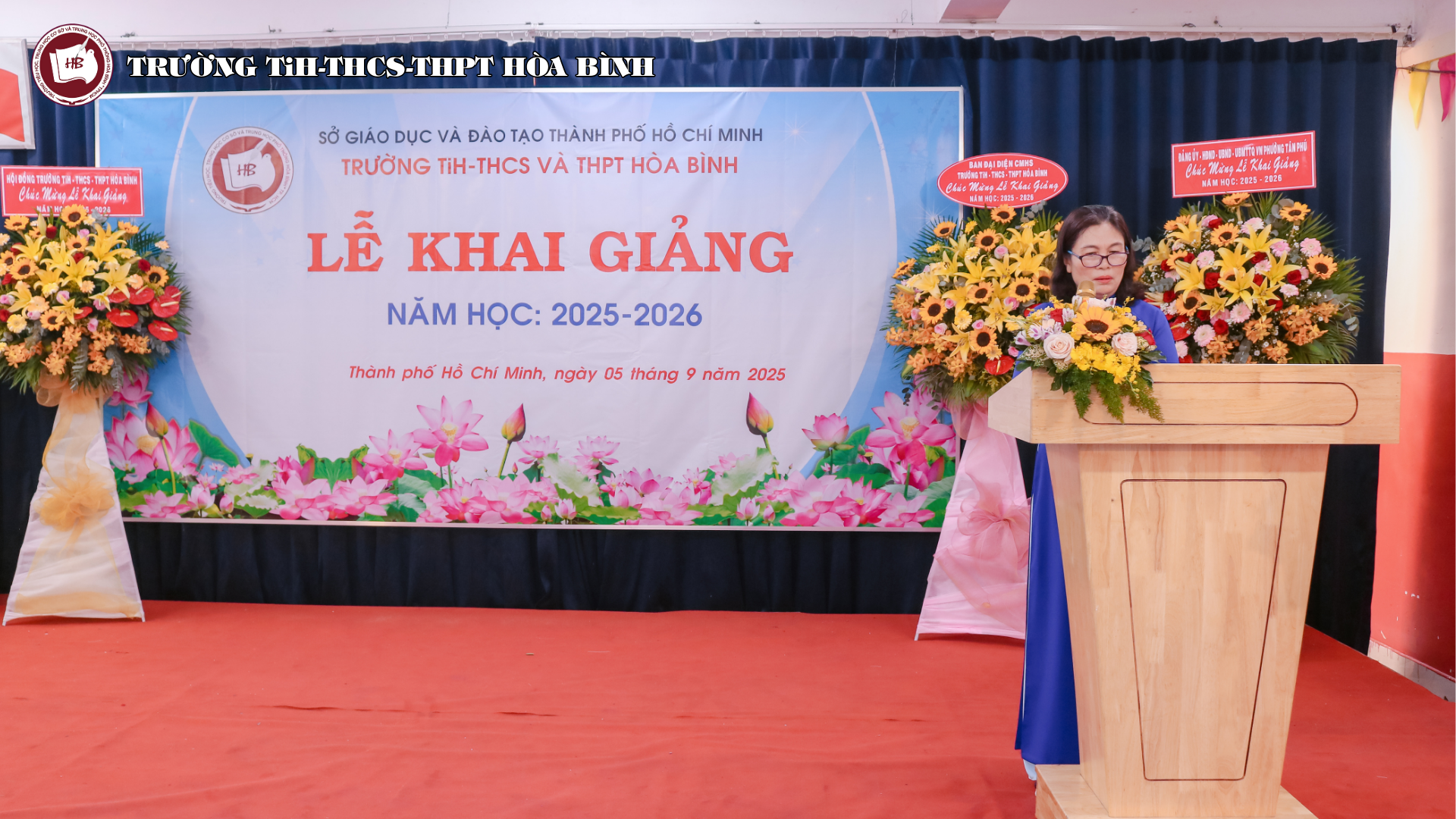Thay mặt Ban Giám hiệu, cô Nguyễn Thị Tâm – Phó Hiệu trưởng đã trang trọng đọc Diễn văn Khai giảng năm học 2025 – 2026. Bài diễn văn nhấn mạnh sứ mệnh giáo dục học sinh trở thành những công dân bản lĩnh, nhân ái, sáng tạo và hội nhập, đồng thời khẳng định quyết tâm của tập thể sư phạm Hòa Bình trong việc xây dựng môi trường học tập chất lượng, giàu tính nhân văn.